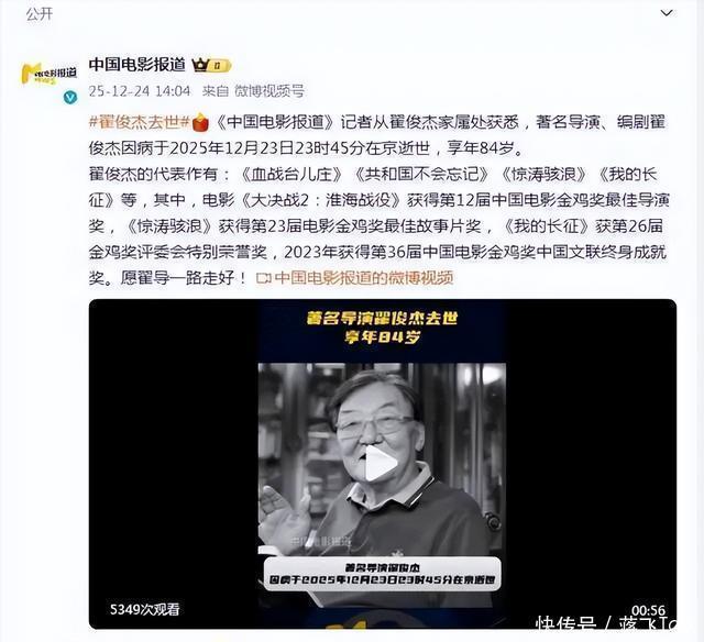 哀悼:著名导演去世 当然,娱乐圈不止有幸福和疑云,更有无法避免的遗憾。 2025年12月23日,著名导演、编剧翟俊杰,因病在北京不幸逝世,享年84岁。 该消息由《中国电影报道》记者报道,引发全网惊讶。