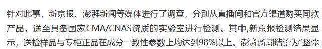 而在最近,事件有了全新进展。 权威鉴定机构,通过对数款随机抽取的涉事货物检测下, 得出了其贾乃亮商品,与专柜正品相似度高达98%以上; 这一权威报道,证实了贾乃亮直播间销售的商品为真货的可能。